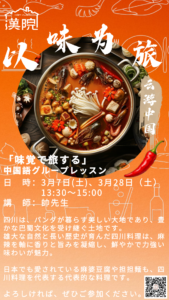 このたび、四川の伝統文化・歴史・風土、そして川菜の特徴や背景を深く学べる文化紹介クラスを開講いたします。料理を食べるだけでなく、その背景にある文化や歴史、人々の暮らしまでを知ることで、四川の魅力をより豊かに感じていただける内容となっています。